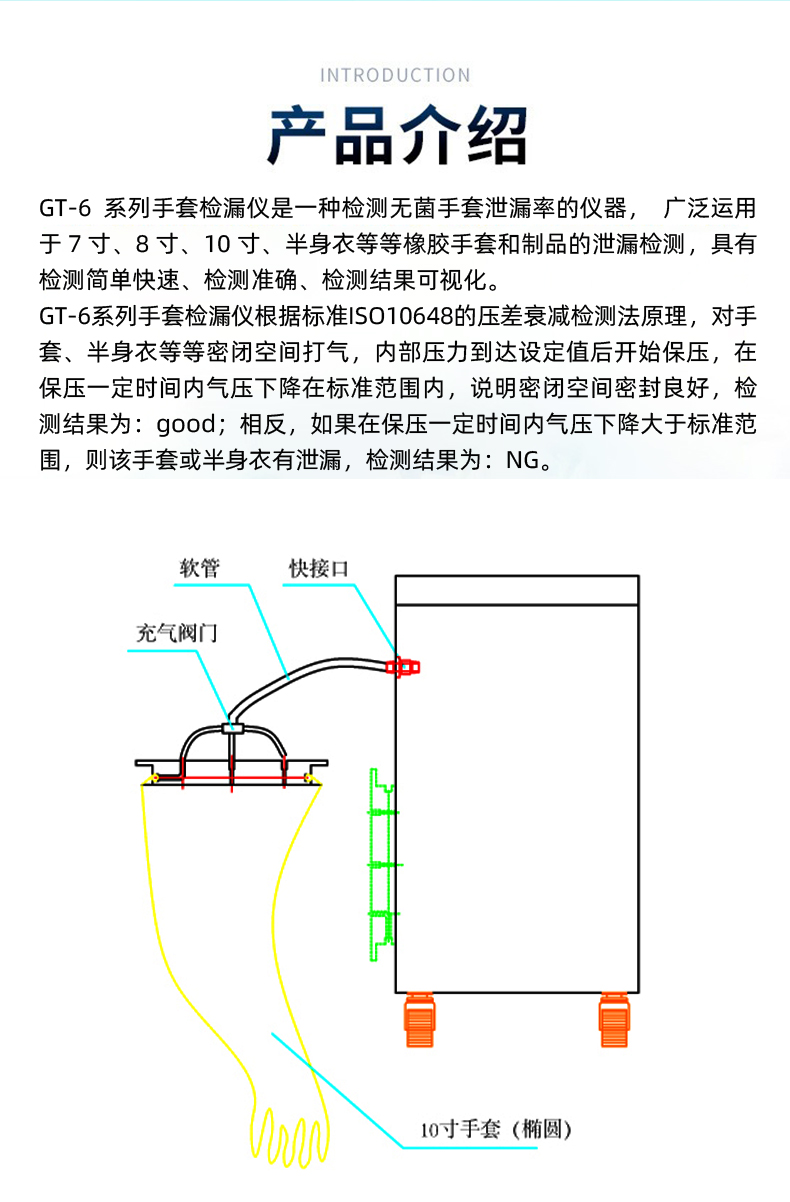 GT系列手套检漏仪是一种检测无菌手套泄漏率的仪器,广泛运用于7寸、8寸、10寸、半身衣等等橡胶手套和制品的泄漏检测,具有检测简单快速、检测准确、检测结果可视化。
