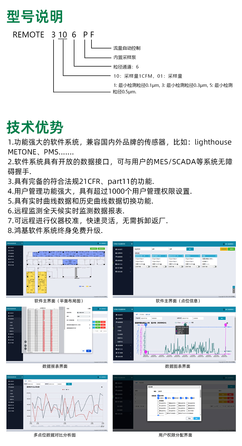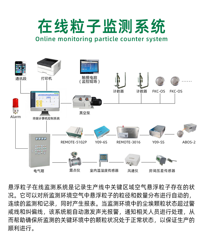 【产品介绍】:在线粒子监测系统是记录生产环境中的温度、湿度、风速、压差、露点、臭氧浓度、含氧量、环境洁净度等等参数的智能化警示系统。